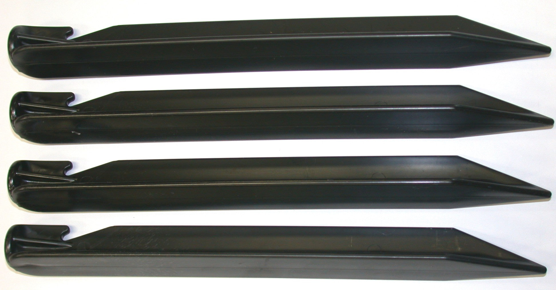 A set of four 10-inch long ABS plastic pegs better suited for sand/beach play, however will work in loose soil without rocks. Not recommend for hard ground setup as any plastic stake will not last long after repeated poundings into the ground. Item priced as a set of four stakes.