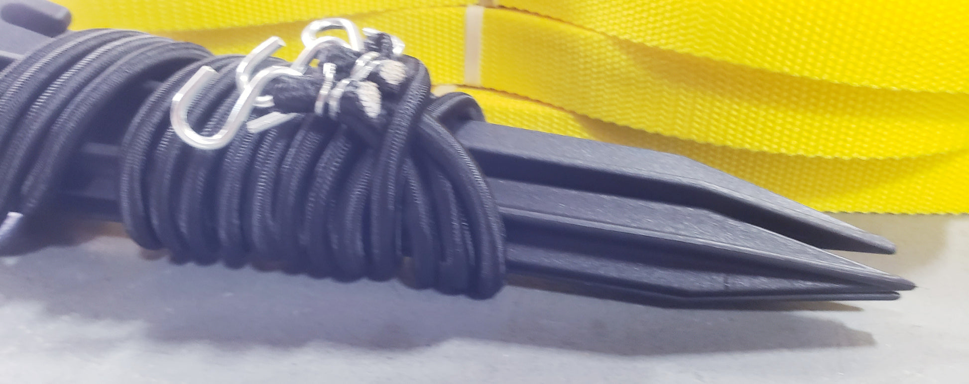 Four ground anchor variations to choose from. Four 10-inch long ABS plastic sand pegs (#BTS). The suspended webbing enables the boundary to form a perfect rectangle. Will then stretch when tripped on for added safety.