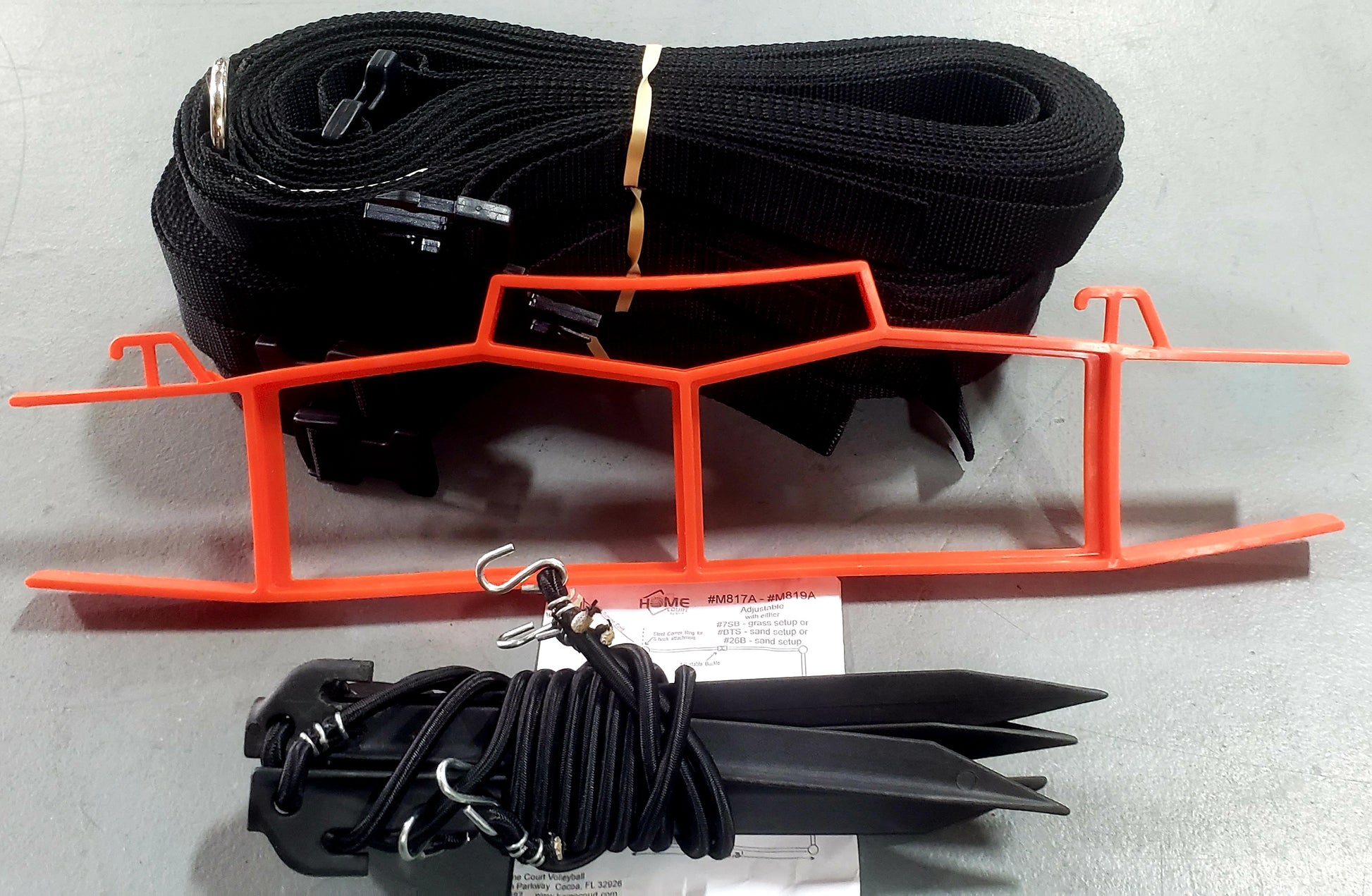 Four 10-inch long ABS plastic sand pegs (#BTS). The suspended webbing enables the boundary to form a perfect rectangle. Will then stretch when tripped on for added safety.