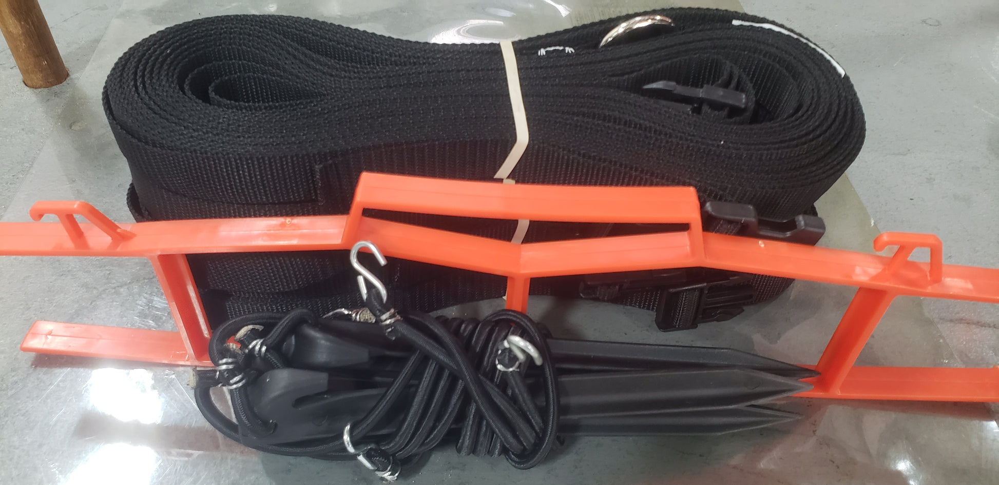 Four 10-inch long ABS plastic sand pegs (#BTS). Anchor types include approximate length of 2-ft by quarter inch thick bungee cord with small zinc plated s-hook. The suspended webbing enables the boundary to form a perfect rectangle. Will then stretch when tripped on for added safety. Made in USA