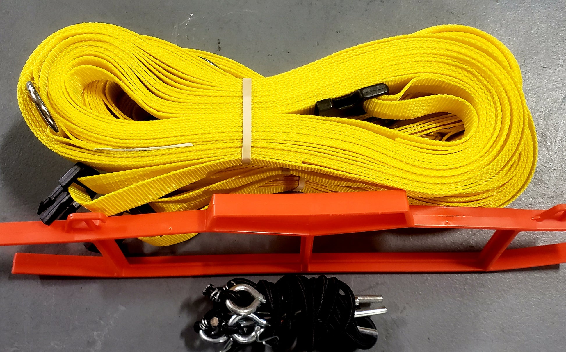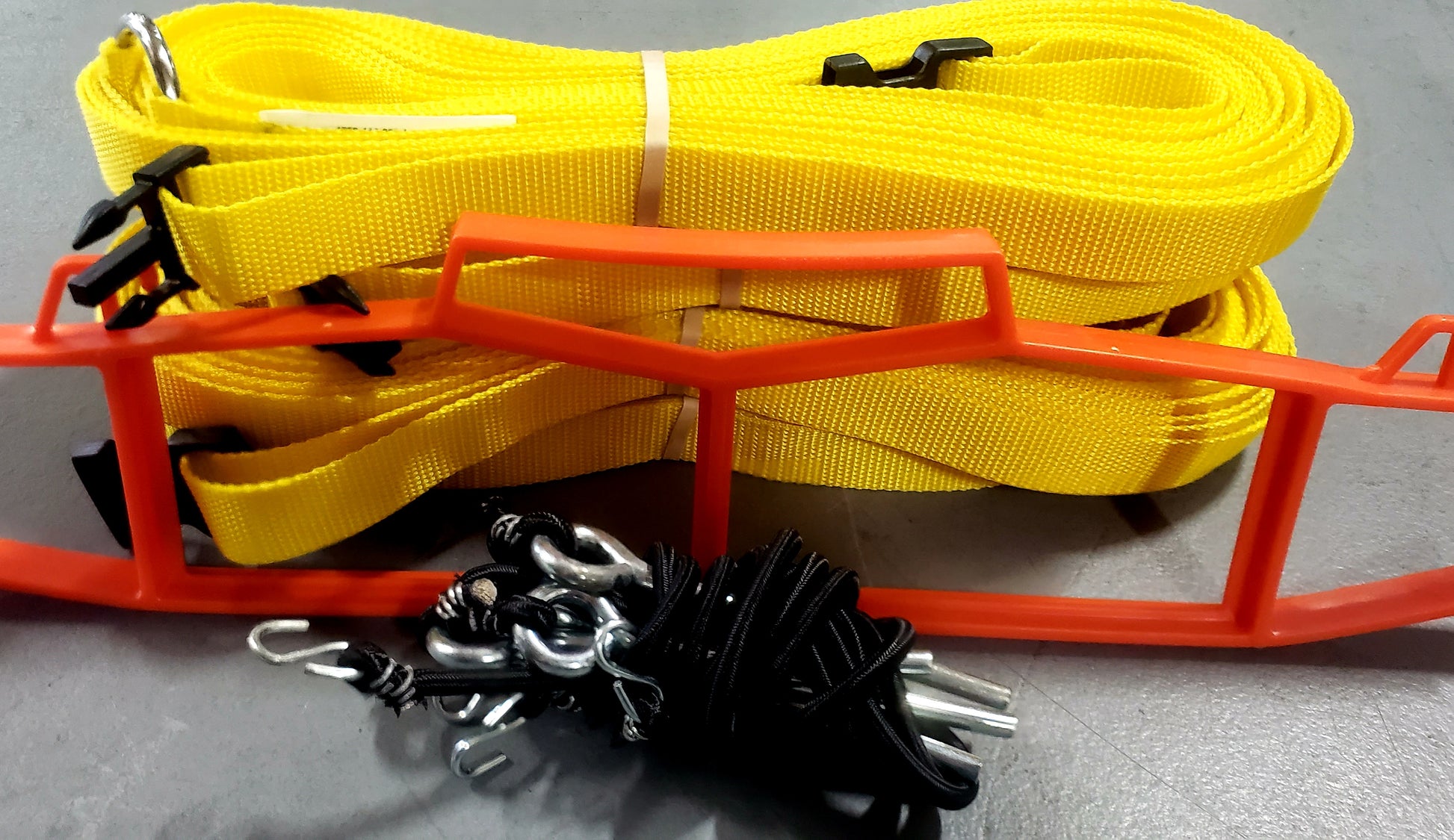 Four 5-inch long steel grass pegs (#7SB). The suspended webbing enables the boundary to form a perfect rectangle. Will then stretch when tripped on for added safety.