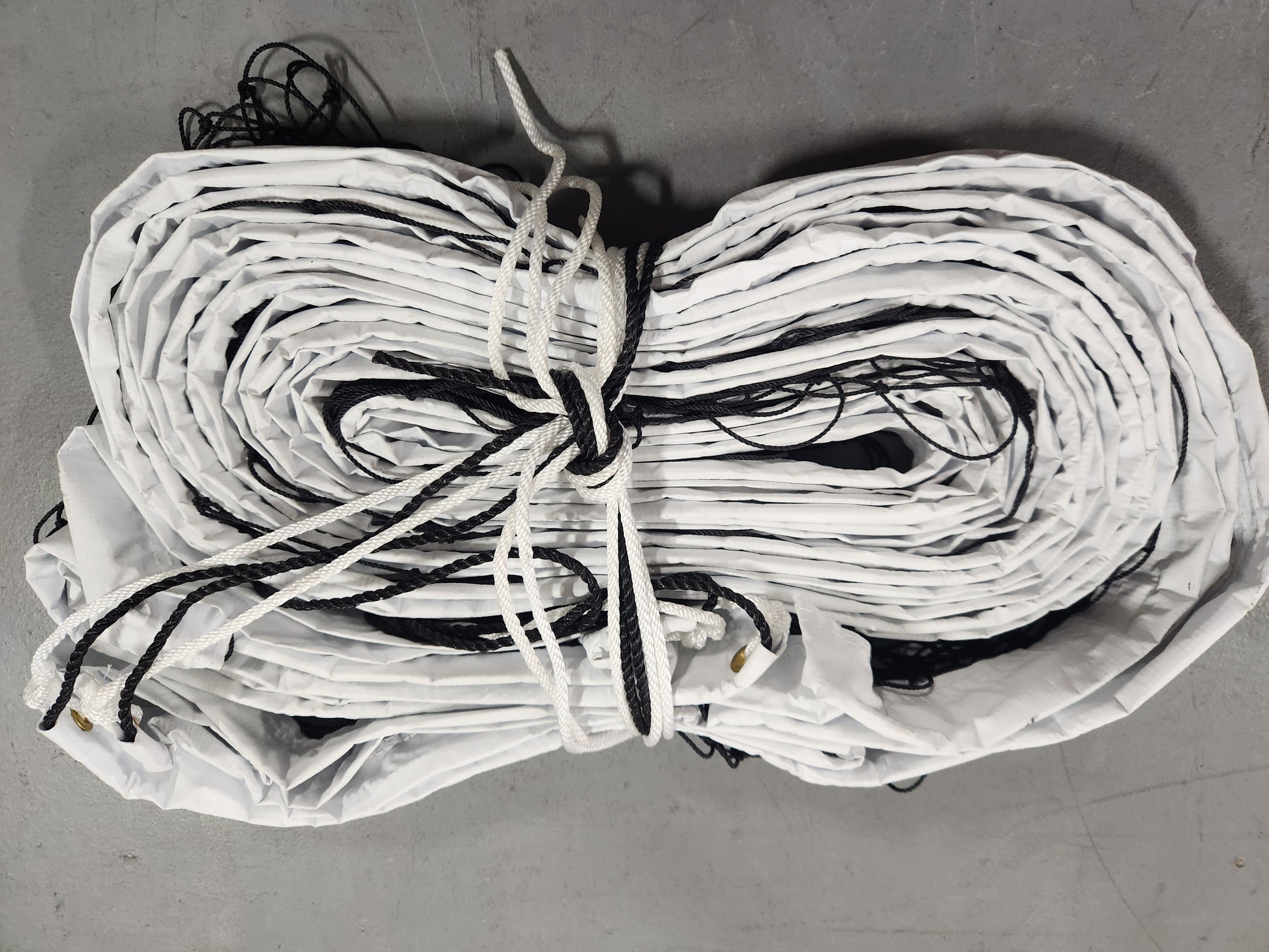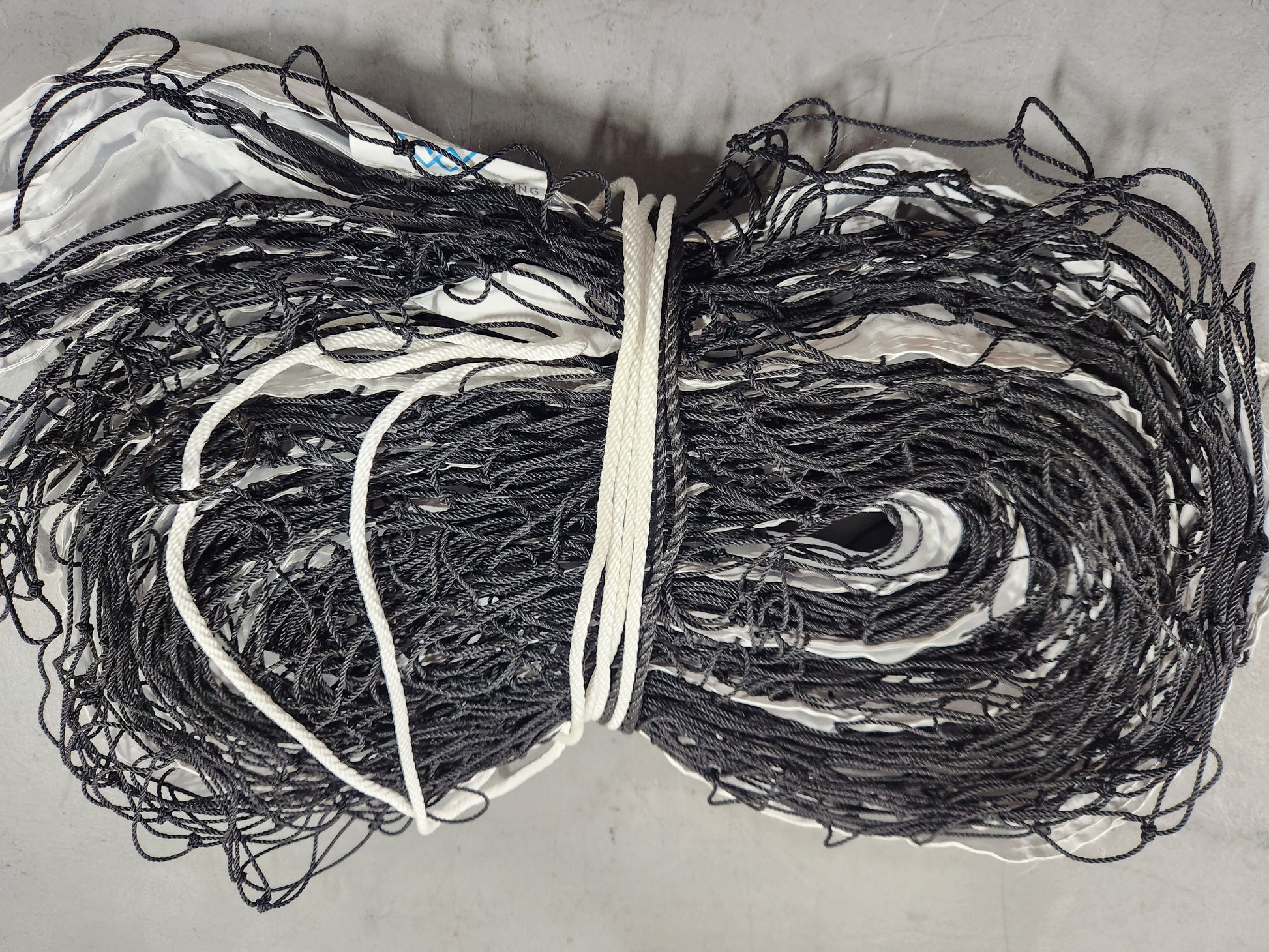 The net is 32 x 3-ft, black weather treated #27 knotted polyester 4-inch mesh netting. Two-inch wide 13-oz vinyl, double stitched top bottom and sides. Two grommets with approximate 40-inch rope tie cords on each net side tape, allowing you to get great ball play out of net.