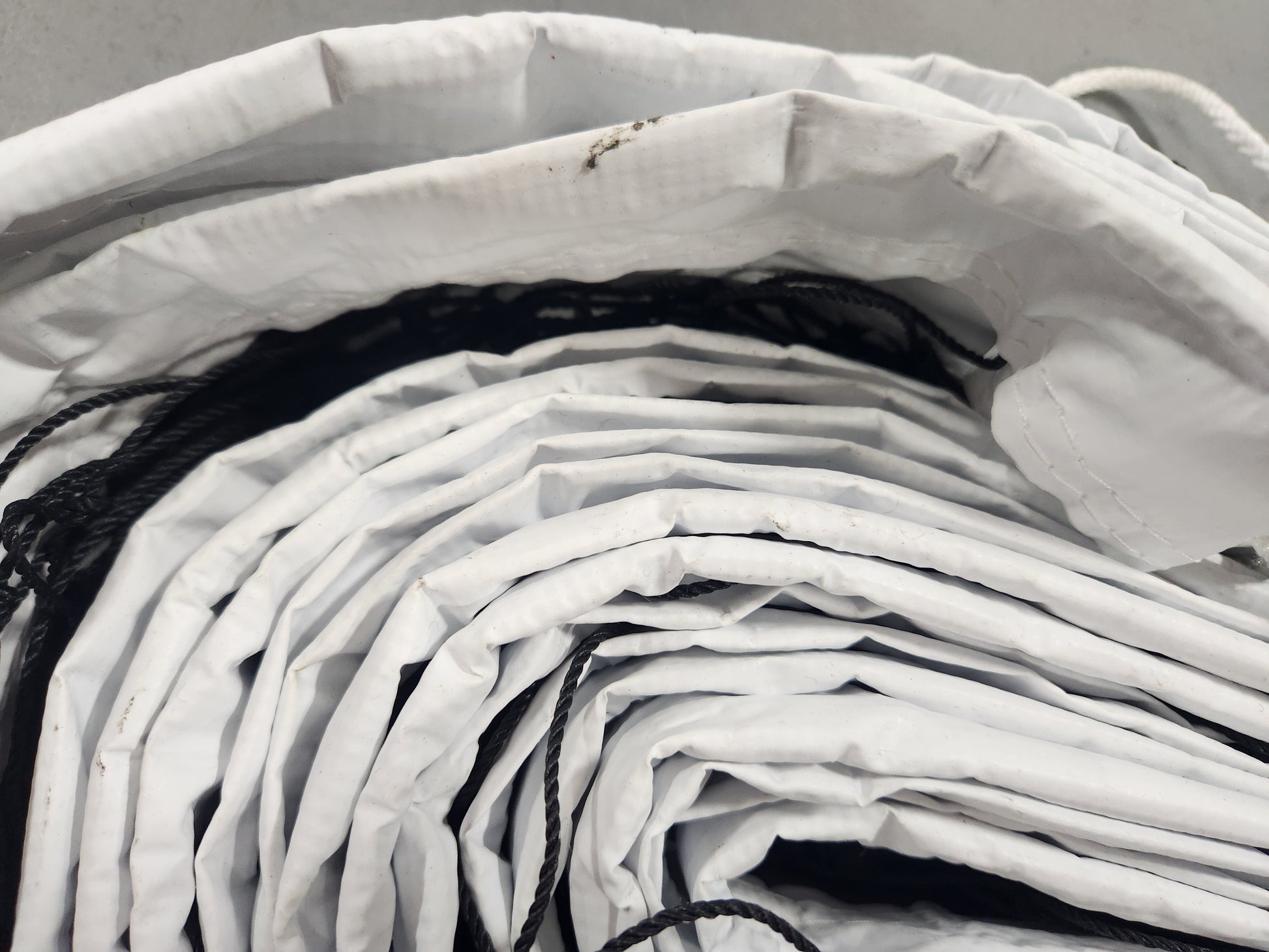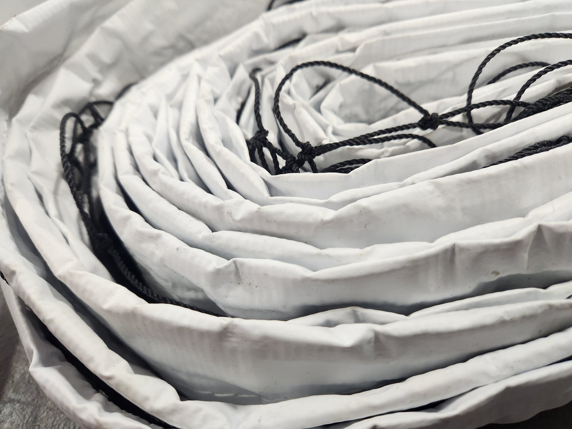Rope lengths are approximate 38-ft top and 36-ft bottom. Twisted three strand 3/16-inch polypropylene rope top and bottom. Call us with any questions.