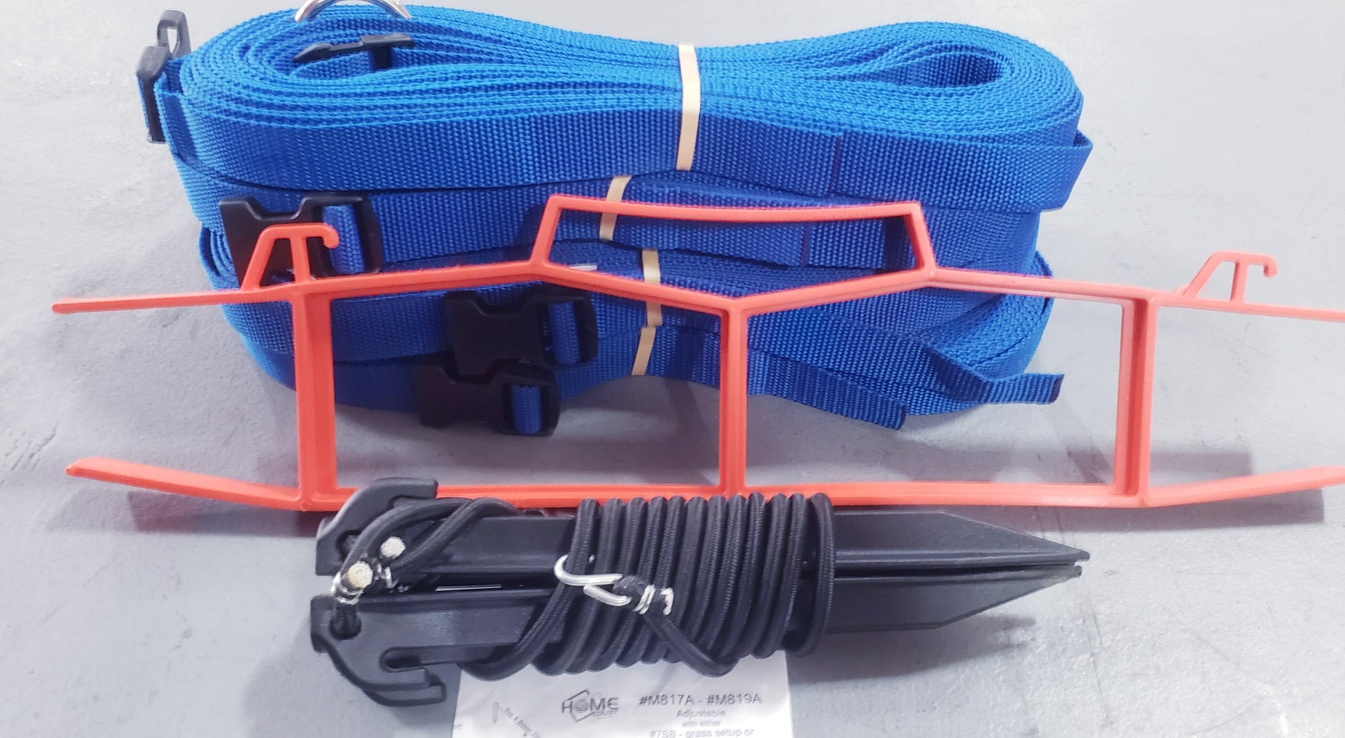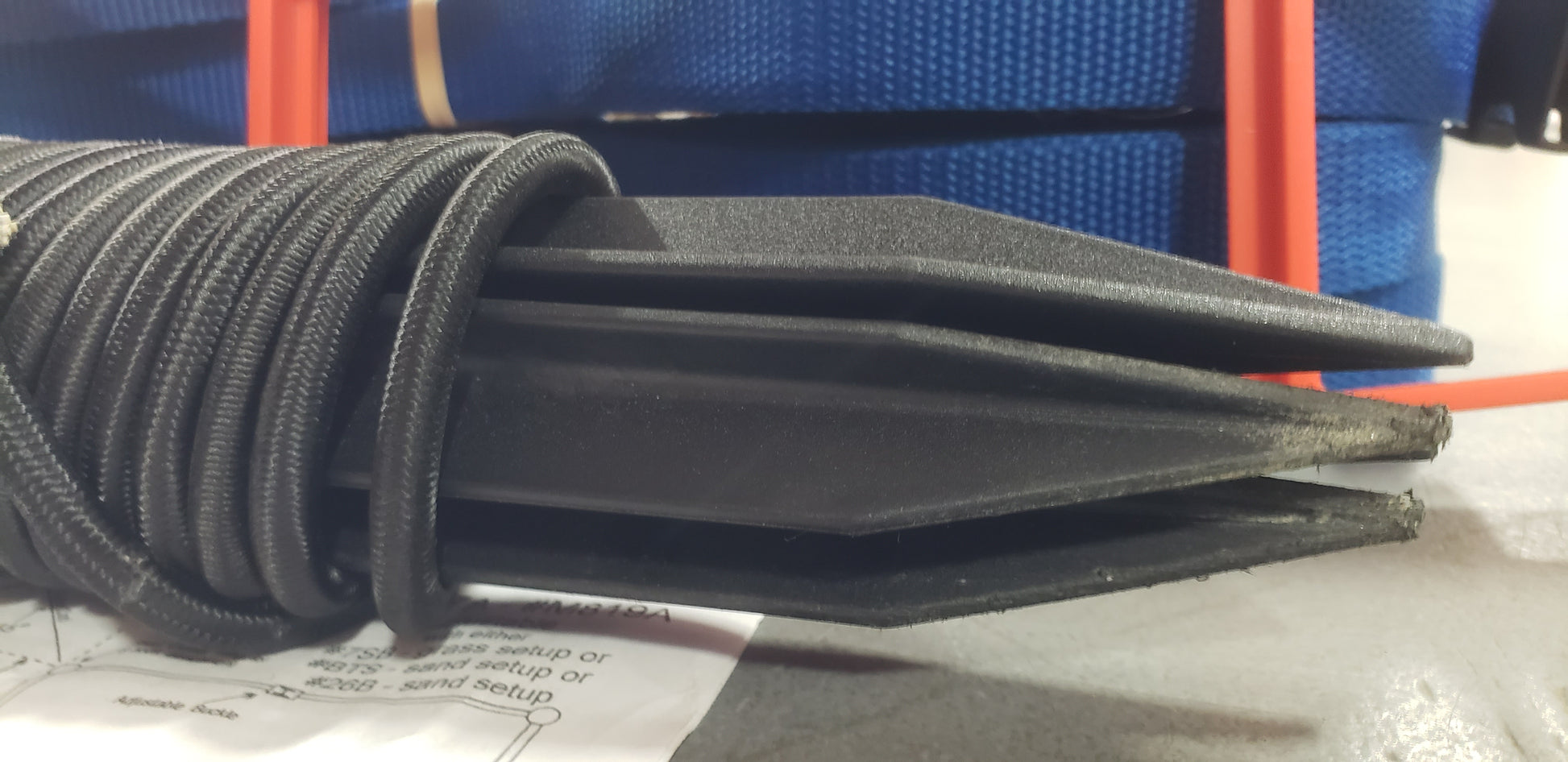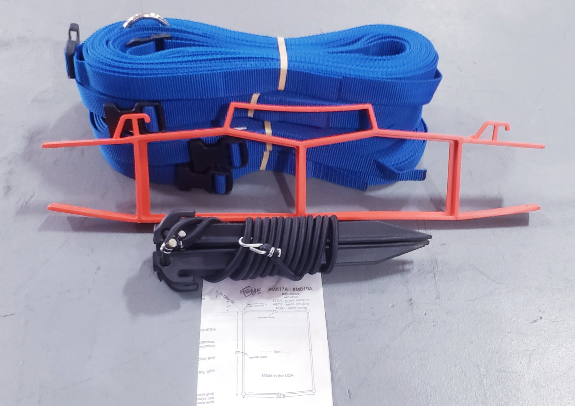 Four 10-inch long ABS plastic sand pegs (#BTS). The suspended webbing enables the boundary to form a perfect rectangle. Will then stretch when tripped on for added safety.