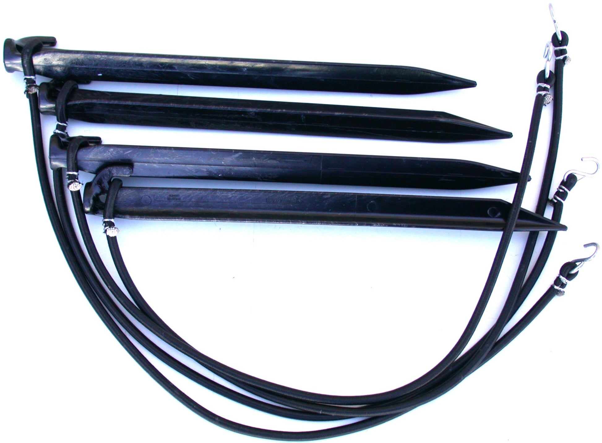 Each peg set has approximate 2-ft of 1/4-inch thick bungee cord and a small s-hook attached on one end. The bungee cord allows the court line to be suspended between the four pegs. Enabling the boundary to form a perfect rectangle and will stretch when tripped on for added safety.